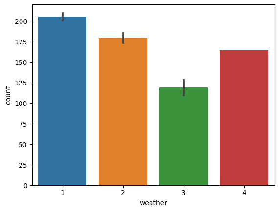 sns.barplot(x='weather', y='count', data=train)